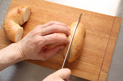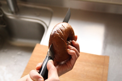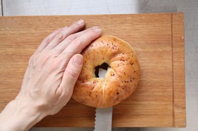 小さいナイフでベーグルを回転させながら切る方法も。