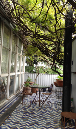 これはたまげた驚いた。タイルの配色も並べる順序も我が家と同じだ。このランダムな並べ方、私けっこう時間をかけて造り上げたのに……よくそこまでやったわねえ。あまりにそっくりなので感動してしまった。フェズまでタイルを探しに出かける酔狂な日本人は、私たちだけだろうと思ってちょっと威張っていたのに……いるんですねえ、妥協を知らぬ情熱的な人はねえ。