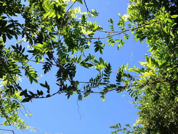台風が去った翌17日の朝、上を見上げると藤の枝の隙間から見える青空!空気はカラリとさわやか。2ヶ月間苦しんできた猛暑とおさらばできると喜んだ。この気候ならOK。さあ、そろそろ活動的になるか、という気持ちになった。