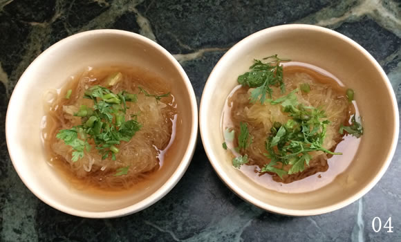 鍋に水を沸騰させ、輪切りを入れて15分ゆでる。水にさらして冷やす。輪切りの内側を軽く引っ掻くと、あら不思議! 繊細な麺状のものがはらはらと剥がれるのでびっくり。麺状の果肉を水にさらしながら優しくほぐし水を切る。「嘘でしょ、嘘でしょ」。最初この野菜を調理したとき、指先で触るだけで細麺に変わっていく様子がまるでマジックのように感じていい気分だった。いっときだけのマジシャン気分も悪くはない。涼しげな色の美しい麺はこれにて完成。
